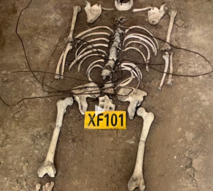 有的尸骨被铁丝捆绑、戴着镣铐或脖套等。