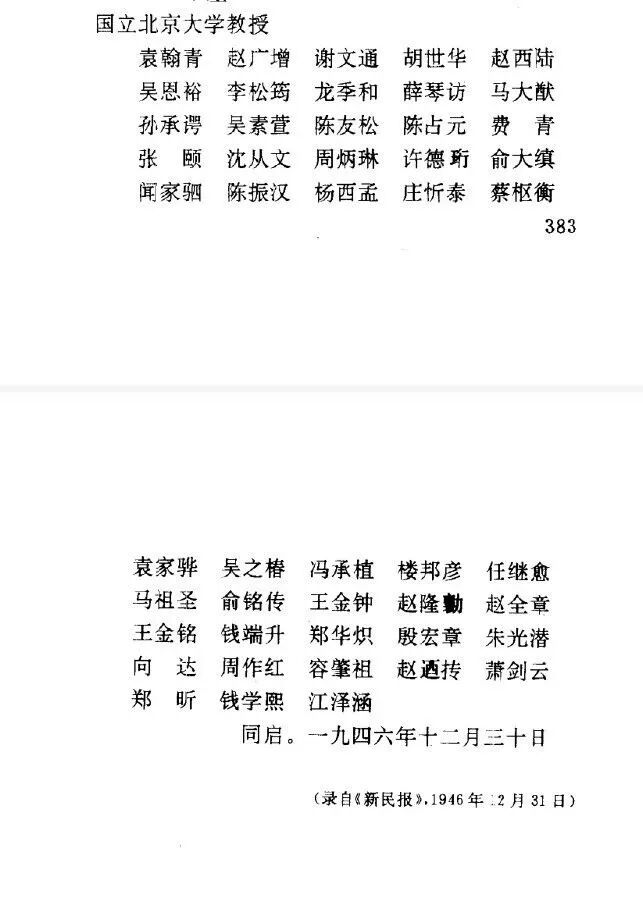 12月30日,北大48名教授写联名信登报抗议美军暴行,但胡适接到消息后,拒绝署名。