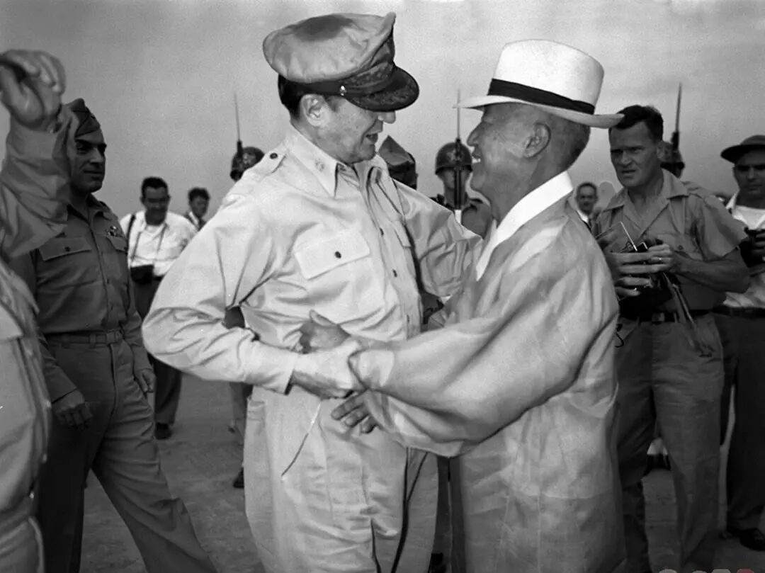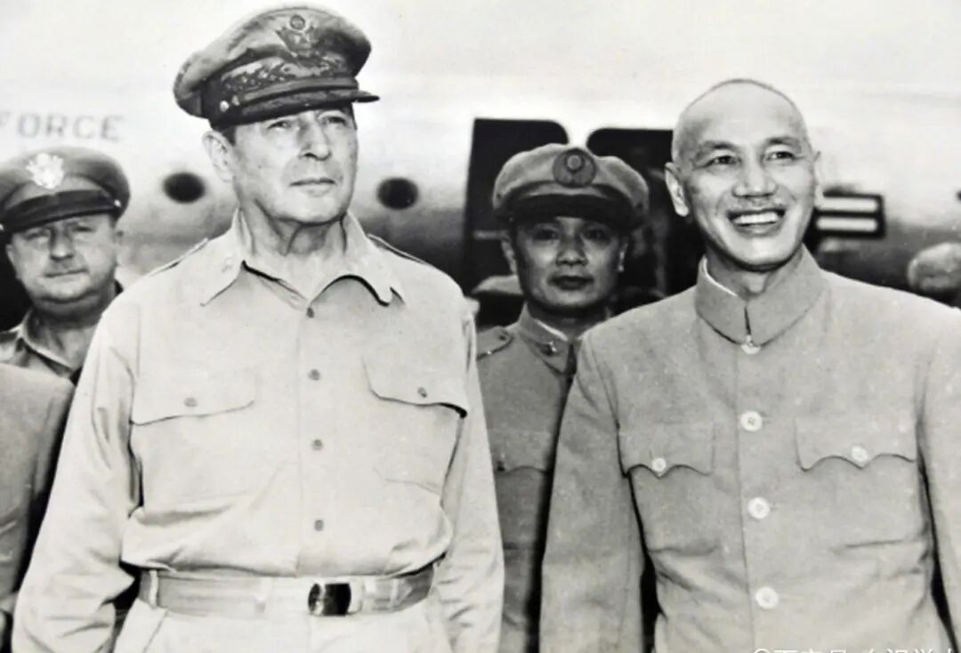 麦克阿瑟笑容满面地紧紧握住蒋介石的手,亲热得两个拜把兄弟,尽管不久前,麦克阿瑟还在策划如何干掉蒋介石,以便于将台湾控制起来。