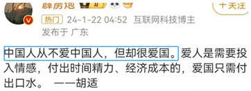 如有人借胡适的口说,“中国人从不爱中国人,但却很爱国”。胡适的品格很差,但水平多少还是有的,大概率不会说出如此没水准的话。中国和中国人的利益天然是一致的,爱国与爱中国人怎么可能冲突呢?公知这么说,潜台词无非是他们爱的是人,而不是国,但他们连中国都不爱,又怎么可能爱中国人呢?