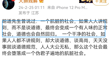 又如有人借胡适的口说,“一个肮脏的社会,如果人人讲规则,而不是谈道德,最终会变成一个有人味的正常社会,道德也会自然回归。一个干净的社会,如果人人都不讲规则,却大谈道德、谈高尚,天天没事就谈道德规范,人人大公无私,那么这个社会最终会堕落成一个伪君子遍地的肮脏社会”。这公知味十足的言论大概率又是公知自编自导然后按在胡适头上的。还是那句话,胡适的人品很烂,但水平多少还是有的,以胡适的水平还不至于把道德和规则割裂开来。先有道德,后有规则,不符合道德的规则是不存在的。如果人人都用道德规范自我约束,那自然人人守规则,怎么可能有人只讲规则,不讲道德呢?