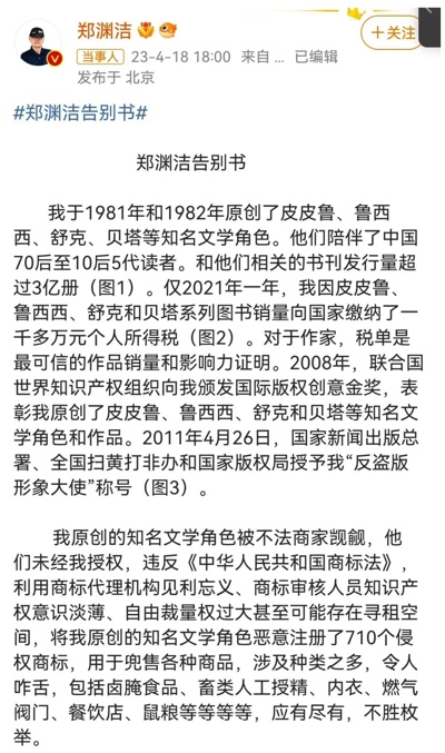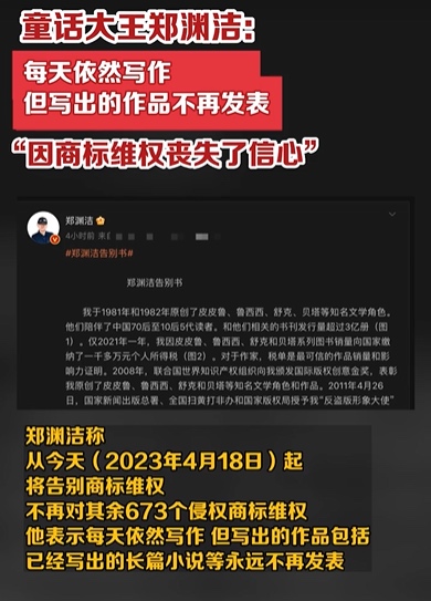 这样的一个知名作家,近日来却发了泣血长文,声称自己被大量侵权,21年来只维权成功了37个侵权商标,平均每个侵权商标维权成功需要6年时间,还有673个侵权商标没有维权成功。