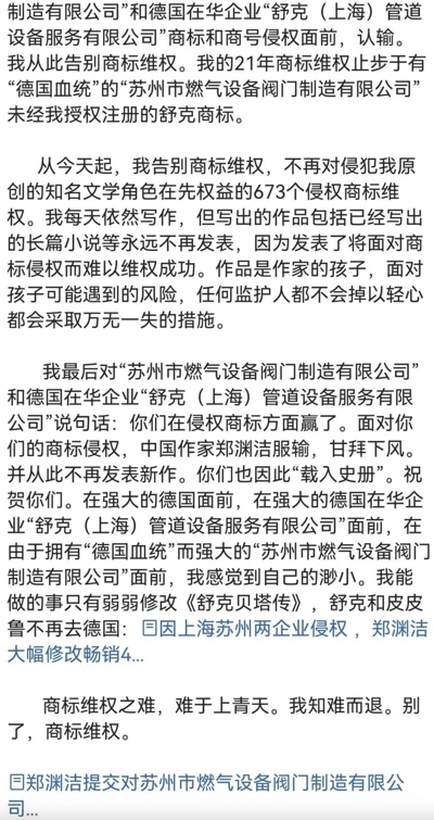 某作家说自己已经对在中国维权丧失了信心,就此认输,他说自己从今天起放弃商标维权,不再对所有商标侵权行为发起诉讼,同时自己继续写的新作品,但再也不会发表。