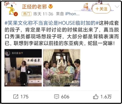 导语:近年“笑果文化翻车事件”的多次发生,其实并非特例和个案,这是一种长期存在的坏风气问题。作为具有巨大影响力的笑果文化频频翻车背后,是中国的文艺文化圈病态问题突出,文艺界、文化圈里头的病,到了该依法从严整顿、依规从重处罚的地步了。否则,类似的舆论渗透与文化荼毒问题,会越来越严重。