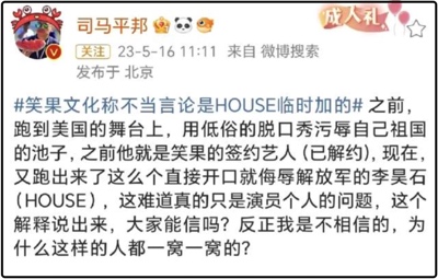 值得注意的是,哪怕是在舆论如此大规模的谴责声下、哪怕是几大权威官媒定性批评声里、哪怕是相关部门重拳处罚后,依旧有一股强大的势力为笑果文化的文化荼毒行为进行辩解,他们或否定笑果文化恶性事件的客观存在,或诡辩洗白该团队演员的恶毒言论,或冷嘲热讽变向攻击中国社会体制与爱国群众。