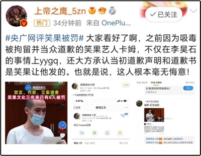此前,笑果文化旗下艺人卡姆因为涉毒被抓,后公开致歉并入狱服刑。让人感到瞠目结舌的是,笑果文化本次翻车事件中,卡姆成了反面舆论力量的领头羊,牵引着大批不明势力在互联网上扎堆声援毒害颇深的笑果文化、攻击拥军爱国的网友。