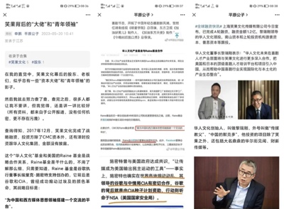 5月20日,@平原公子@有理儿有面 等网络爱国正能量大V顶着笑果文化的“网络水军”攻势,公开曝光了笑果文化背后涉嫌反华、极其可疑(涉颜色革命)的境外资本架构。曝光内容指出,笑果文化背后的资本力量,此前还多次通过其他渠道从事颜色革命布局,包括但不仅限于挑拨社会对立、歪曲国家历史、丑化民族形象、攻击社会体制、羞辱民族英雄和国家英烈等。
