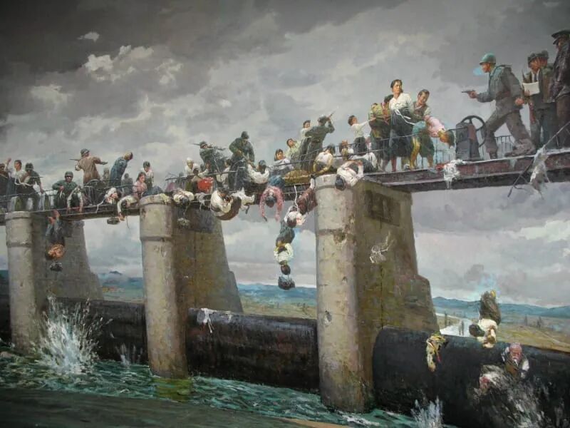 顷刻间,成百上千的无辜平民落水遇难,侥幸未死的难民落水游到岸边后,美军就站在岸边用机枪扫射,血染洛东江。