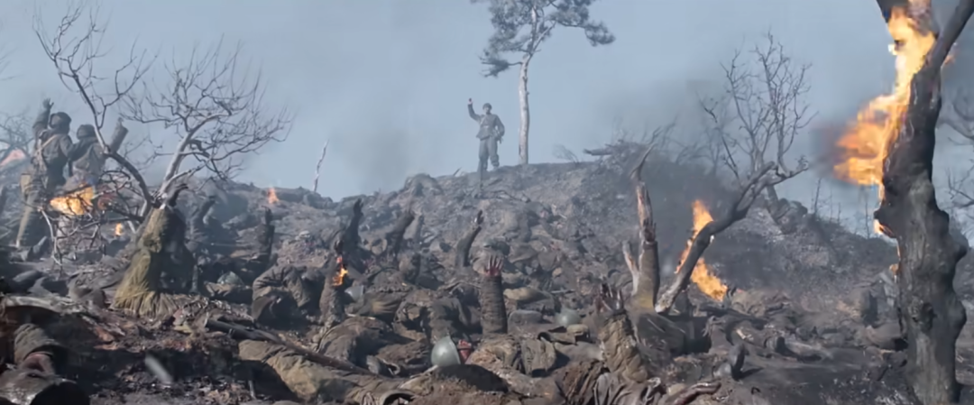 电影中,松骨峰战斗拼杀到惨烈时刻,美军又一轮轰炸和炮火洗地后,三连指导员杨少成从焦土中爬起来,大声呼喊三连的战友:“三连还有没有人活着的!”回声涤荡山岗,久久未有应答。