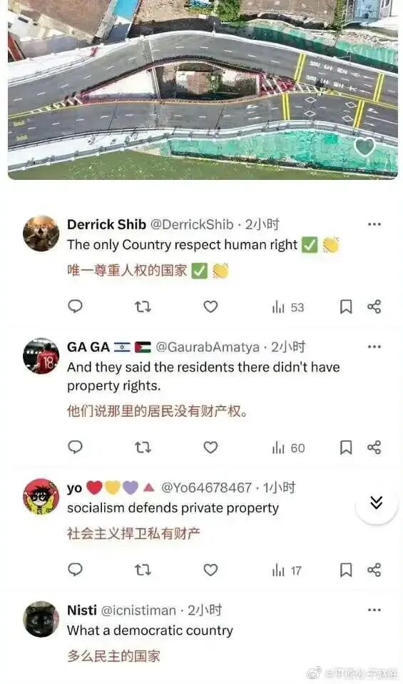 最离谱的是,某个钉子户被高速公路绕过的图片,也被外国网友夸赞有加,他们说:“你看看,多么民主的国家,社会主义才讲人权,这才是真正的私有财产神圣不能侵犯”。