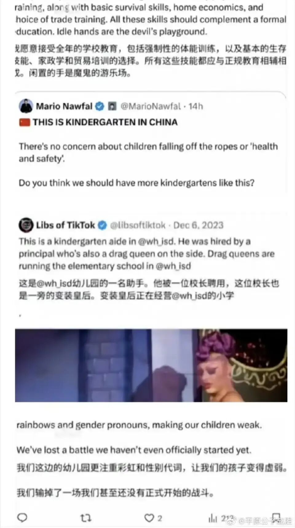 他们甚至还认为我国的幼儿园教育都是“特种兵”的教育,我们的小孩子都是能文能武、从小就掌握各种技能的超人……实际上,是他们自己痛心于他们垮掉的基础教育、他们被LGBT疯狂渗透的幼儿生活,所以,他们就对着视频和图片,脑补出了一个天顶星文明的东方大国,这确实是借他人酒杯,浇自己块垒。