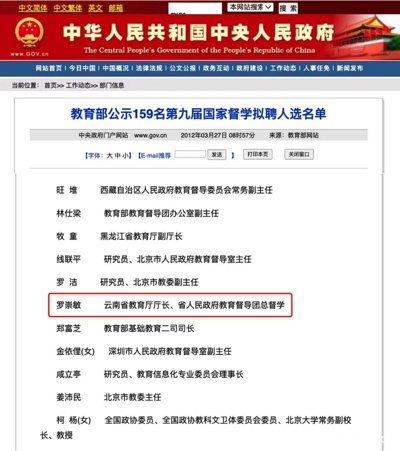云南省教育厅6日的公告中白纸黑字地写着罗崇敏「2013年10月至2016年10月聘任为第九届国家督学」。