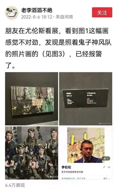 昨天傍晚,有网民在今日头条平台上发布帖子称朋友在尤伦斯看画展,却发现一幅画不对劲,仔细看后发现居然是照着鬼子的“神风敢死队”的照片画的。