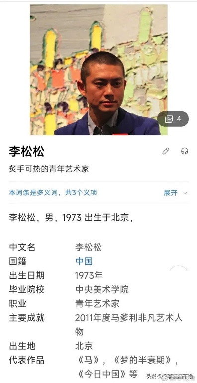 该网民还贴出李松松公开的信息:北京人,毕业于中央美术学院,称之为“炙手可热的青年艺术家”。