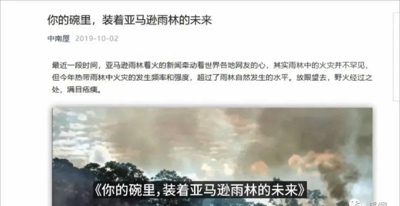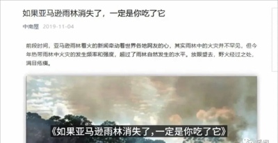 比如2019年被美国政府所控制的反华机构中南屋曾连续发布的文章,称是中国人吃肉毁了亚马逊雨林。