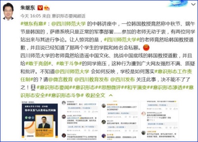 四川师范大学的老师竟然给造谣中国文化、挑战中国底线的韩国教授道歉,并且给#敢于亮剑#、#敢于斗争#的同学施压,这种行为遭到广大网友强烈不满、质疑和批评。不知道@四川师范大学 会如何反映,学校是如何落实#意识形态工作责任制#的?请@微言教育@四川教育发布@四川发布 关注此事,决不能不了了之!