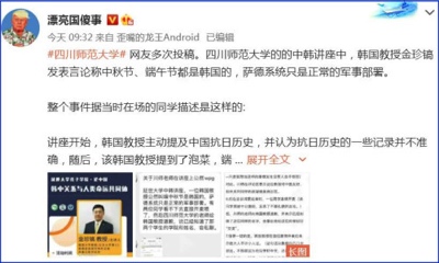 近日,四川师范大学的中韩讲座中,韩国教授金XX发表言论称中秋节、端午节都是韩国的,萨德系统只是正常的军事部署,引发在校学生不满。