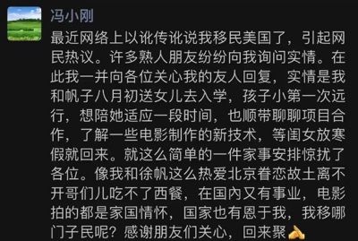 最近有关著名导演冯小刚移民美国的新闻刷屏了,先是有网民上传了冯小刚夫妇在美国家门口送客的照片,疑似移民美国。然后冯小刚发微信朋友圈辟谣,声称受国隆恩,事业亲人朋友都在中国,还吃不惯西餐,移什么民,还说过年回来聚。