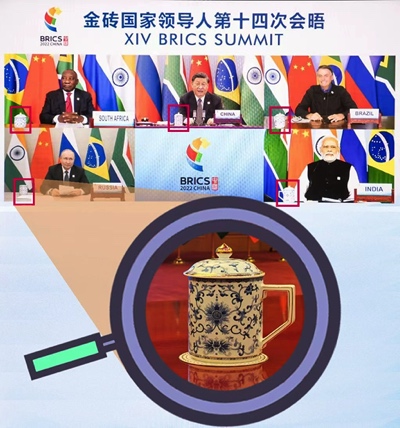 ▲ 2022年6月23日,金砖国家领导人第十四次会晤中,中国在礼宾细节方面诚意满满。五国领导人同用体现中国特色的青花珐琅茶杯,实现了“天涯同饮一杯中国茶”。