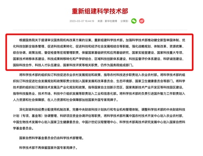2023年3月7日下午4时许,新华社通报了一则消息:中国将重新组建科学技术部。