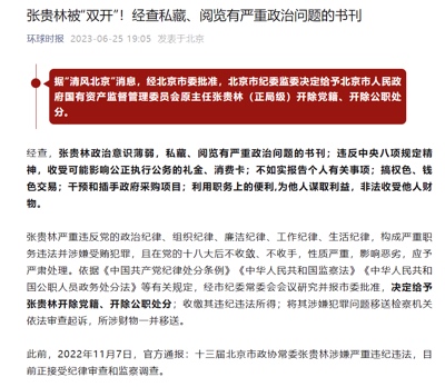 2023年6月25日,据北京市纪委官方账号“清风北京”发布消息称:“据北京市纪委监委消息:经北京市委批准,北京市纪委监委决定给予北京市人民政府国有资产监督管理委员会原主任张贵林(正局级)开除党籍、开除公职处分。”“经查,张贵林政治意识薄弱,私藏、阅览有严重政治问题的书刊;违反中央八项规定精神,收受可能影响公正执行公务的礼金、消费卡;不如实报告个人有关事项;搞权色、钱色交易;干预和插手政府采购项目;利用职务上的便利,为他人谋取利益,非法收受他人财物。”
