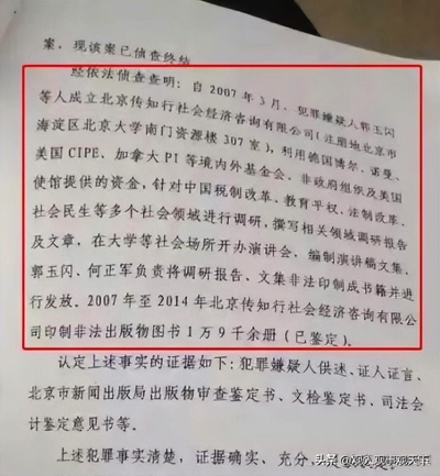 在郭玉闪非法经营案立案期间,经依法侦查查明:“自2007年3月起,郭玉闪成立北京传知行公司,利用德国博尔、诺曼、美国CIPE、加拿大PI等境内外基金会、非政府组织及美国使馆的资金支持,散播研究中国体制等非法文宣制书发送,犯罪事实清楚,证据确实充分,移送起诉。”