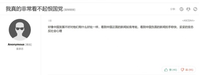 标题叫做《我本人非常看不起恨国党》,内容没啥问题,问题在于这个帖子下的两条回帖,一条是比较正常,描述的是恨国党这个群体——“好像中国不发展对他们有什么好处一样,看到中国正面的新闻就如丧考妣,看到中国负面的新闻就拍手称快,妥妥的变态反人类。”