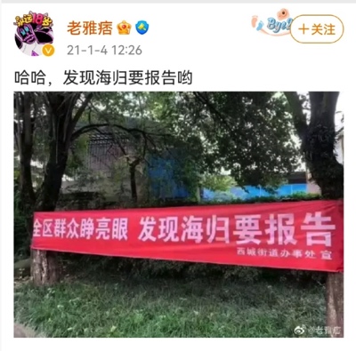 帖子里,这个女画家配了两张图,两张图上分别有一条横幅和一条标语。横幅上写有“群众睁亮眼,发现海归要报告”字样,标语上写有“相互举报是群防群治、自我保护的最好办法!”