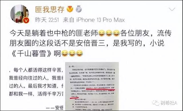 这时一位名叫“匪我思存”的网友出面说了句公道话,因为吕丽萍文案用在安倍晋三头上的这番话是出自这位网友之手,是出自小说《千山暮雪》中,这位网友就是作者。