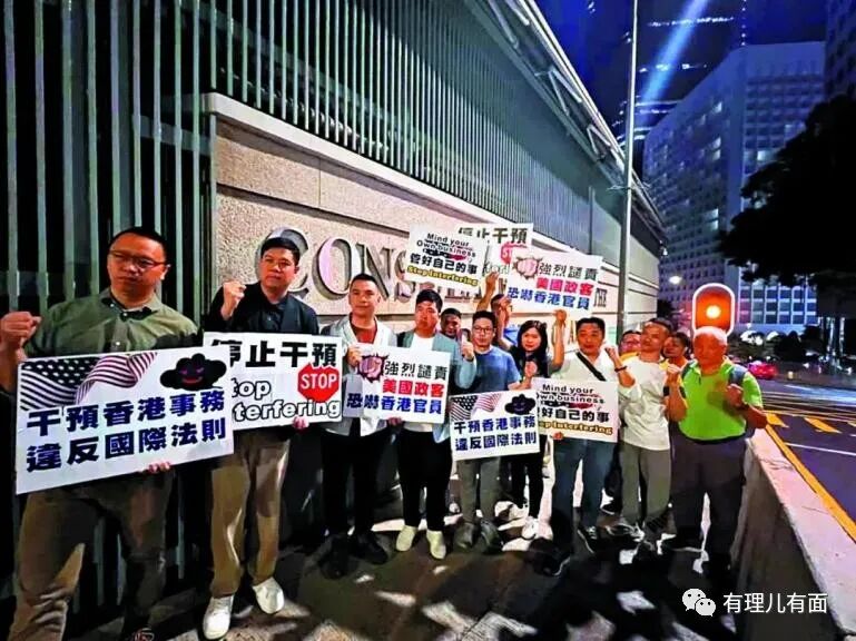 据香港大公报报道,11月5日晚上,大批香港各界人士到美国驻港总领事馆抗议,对美国干预香港事务予以最严厉的谴责。