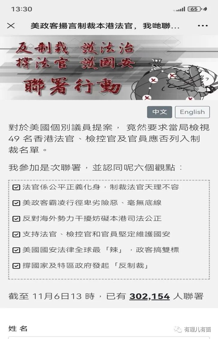 截至今天中午,“反干预 护法治 撑法官”网络关注组近日在网上发起联署,已有30多万人香港市民参加联署。