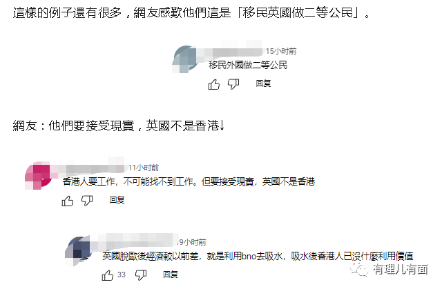 下面评论区,有不少香港网友感叹“人离乡贱”,并质疑一些港人声称为了下一代移居英国,但在英国做“二等公民”,真的是为下一代好吗?
