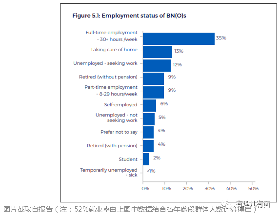 该团体发布最新调查在“就业”一章引人注意,在年龄65岁以下、已离开学校的持BNO护照移英港人中,仅52%的人目前处于就业状态,也就是说许多人没有工作。