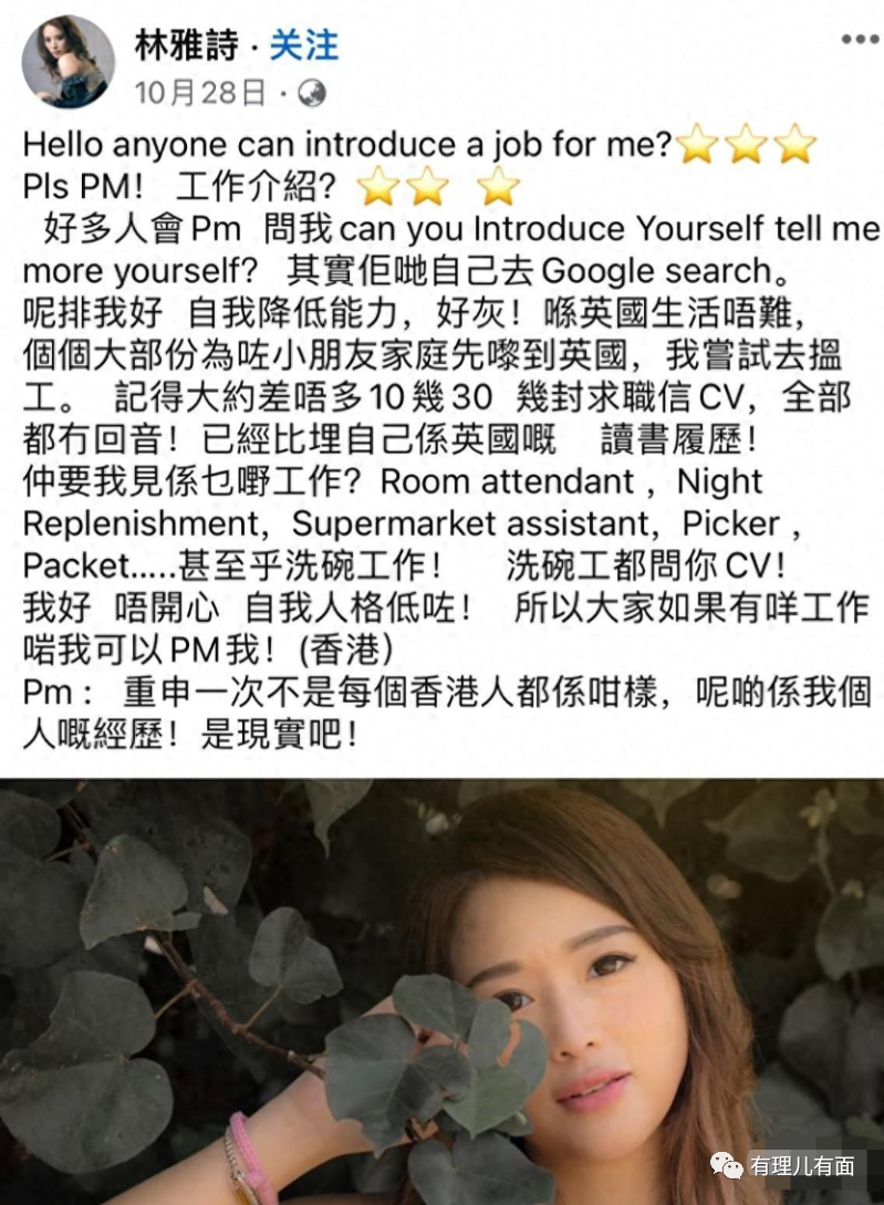 10月28日,她在个人社交平台哭诉,在英国根本找不到工作,数十封求职信,全部都没有回音,而且她还曾在英国念过书。