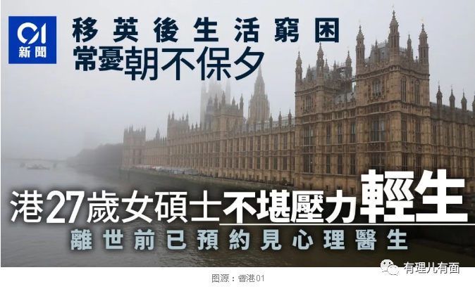 今年年初,有一位27岁香港硕士女生,移去英国后因为工资太低,却又要支付高额的房租和饮食,让她生活得很有压力,于是自杀身亡。