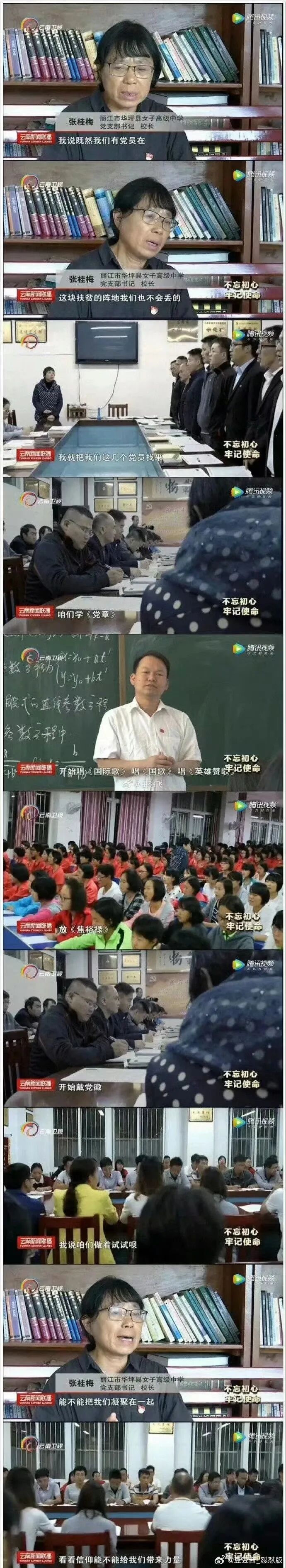 我建议胡先生最好看着党旗、摸着胸口的党章、背诵一下入党誓词。胡先生虽然退休了,但还是党员,党员就要讲党性,讲原则。我不知道胡先生看过这部电影没有,如果看过还能得出这样的结论,只能说明要么需要去看看眼科,要么需要回到小学去重修语文,提高阅读理解能力。如果胡先生没有看过就贸然站队拉偏架,那么就请胡先生背诵《反对本本主义》中的这么一段:“你对于某个问题没有调查,就停止你对于某个问题的发言权。这不太野蛮了吗?一点也不野蛮。你对那个问题的现实情况和历史情况既然没有调查,不知底里,对于那个问题的发言便一定是瞎说一顿。瞎说一顿之不能解决问题是大家明了的,那末,停止你的发言权有什么不公道呢?许多的同志都成天地闭着眼睛在那里瞎说,这是共产党员的耻辱,岂有共产党员而可以闭着眼睛瞎说一顿的吗?”胡先生说《我本是高山》中讲了张老师创办学校时党员宣誓的场景,但胡先生却不肯告诉大家这一幕被鸡贼地使用背景音乐直接掩盖,“隐入烟尘”,根本感受不到那种庄严和神圣。胡先生如果真的看过张老师的纪录片 就该知道,张老师不止一次强调过,她坚持这一切的根本动力,就是她的信仰,她对共产主义和天下大同的追求。