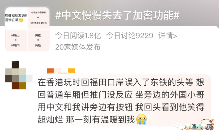 最近,#中文慢慢失去了加密功能#冲上热搜,“在国外真的不能用普通话(mandarin)随便吐槽了,对面那个歪果仁可能和你共用一个语言体系。”引发网友讨论。