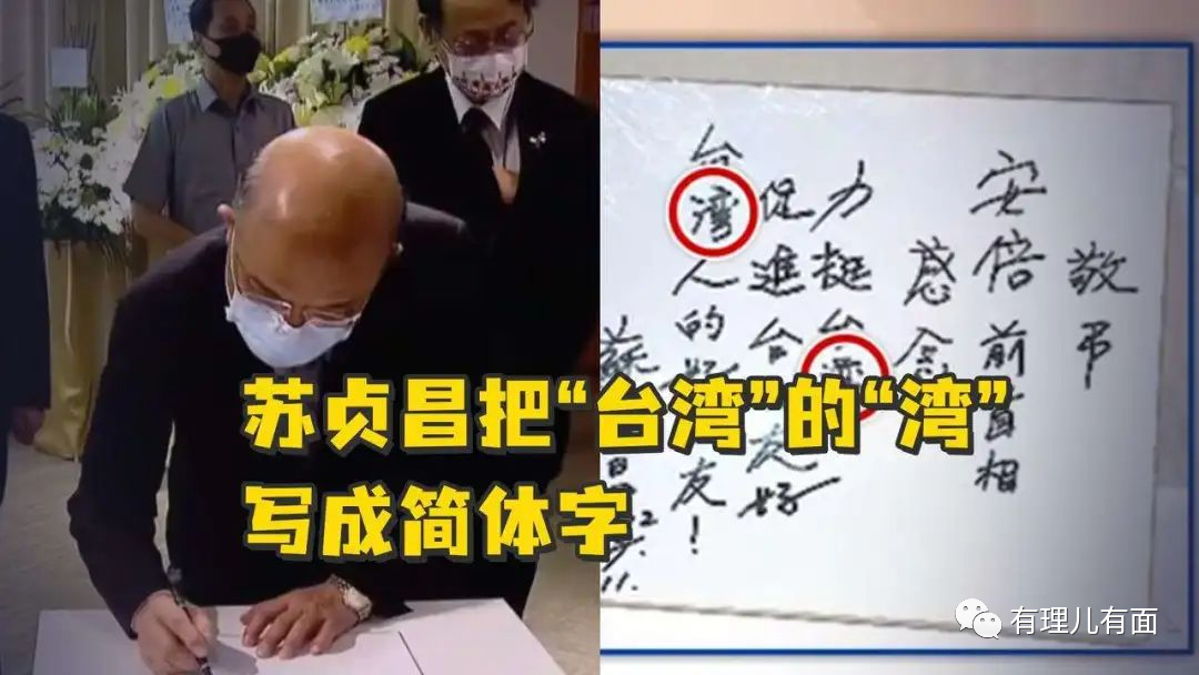 2022年7月,在“日台交流协会”举办的纪念安倍的签名追思会上,所谓“台湾行政院院长”、“台毒”分子苏贞昌把“台湾”的“湾”字写成了简体,遭到了两岸同胞的群嘲。