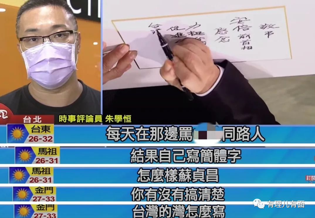 台湾时事评论员朱学恒说:“每天骂别人是‘中共同路人’,结果自己写简体字,你有没有搞清楚台湾的‘湾’怎么写?不会写,不会写繁体字噢”。