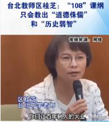 这条短视频来自教学一线的台北第一女子高中语文老师区桂芝,内容是痛批民进党当局2019年版的“108课纲”大量删减文言文,称修改课纲导致学生无法明辨是非,是“无耻课纲”。