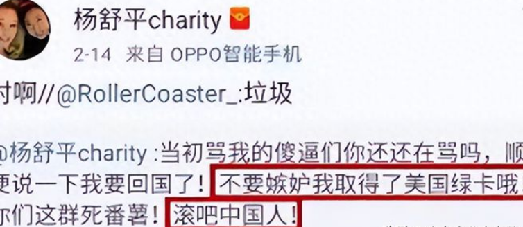 在事态慢慢平息后,杨舒平又在网上对中国网友恶语相向,她在取得美国绿卡后骂“中国人死番薯,要中国人滚”