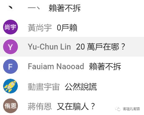 赖清德在辩论会上还污蔑大陆对台湾所造成的“生存威胁”是最大的,台湾民众要团结一致面对来自大陆的“威胁”;抹黑两岸服贸协议会影响百工百业,也会造成台湾社会的不安,等等。而评论区出现最多的字眼就是“赖着不拆”。