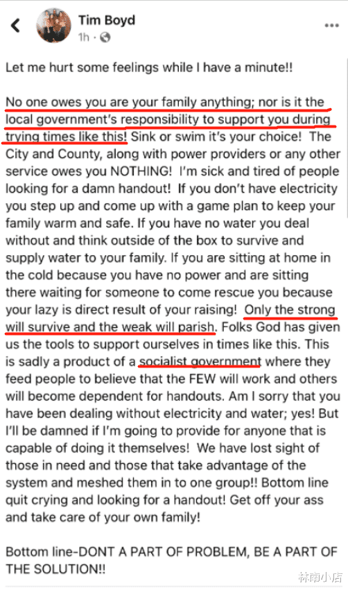 大意是供电局不欠你们,政府也没有责任和义务去救援你们。学会自救,只有强者才能生存下来,救援是社会主义国家才能做的事。
