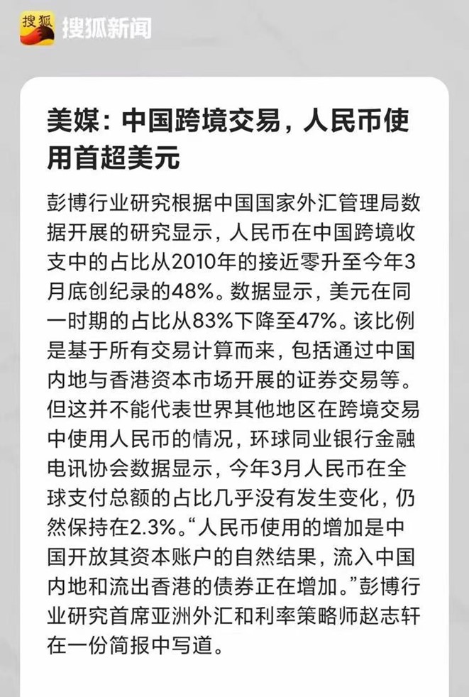 美国的彭博行业研究发现:中国跨境交易,人民币的使用首超美元。