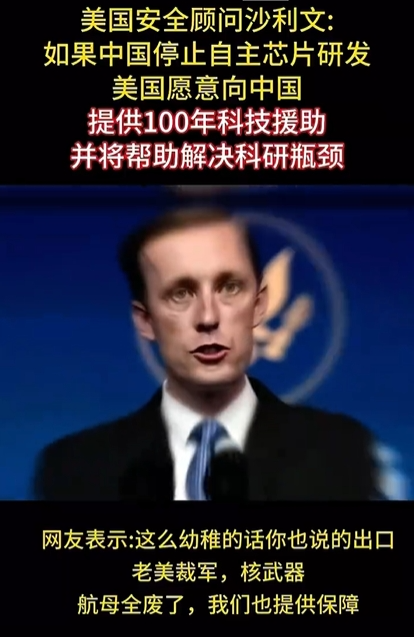 类似的话,美国总统国家安全顾问沙利文也曾讲过,他说什么我们中国如果停止自主芯片研发,美国就愿意向我们提供一百年的科技援助,帮我们解决瓶颈问题。