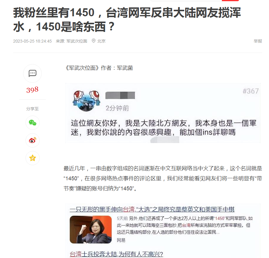 绿营还组成1450水军,在网上不断散布谣言,混淆视听,甚至与美日间谍勾连,在网上实施网特破坏行动。