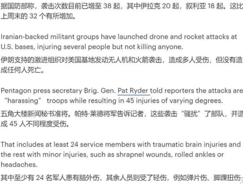 从10月份至今,驻叙利亚和伊拉克的美军已经连续遭到超过40次袭击。虽然美军对外宣布没有人员死亡,但“负伤”的情况就不得不公布了,按照美军自己发布的消息,仅一次负伤20人以上的袭击至少就有3次之多。在各派武装的打击下,美军在伊拉克和叙利亚的军事基地一片风声鹤唳,在最近一次袭击行动中,美军被导弹炸伤45人......