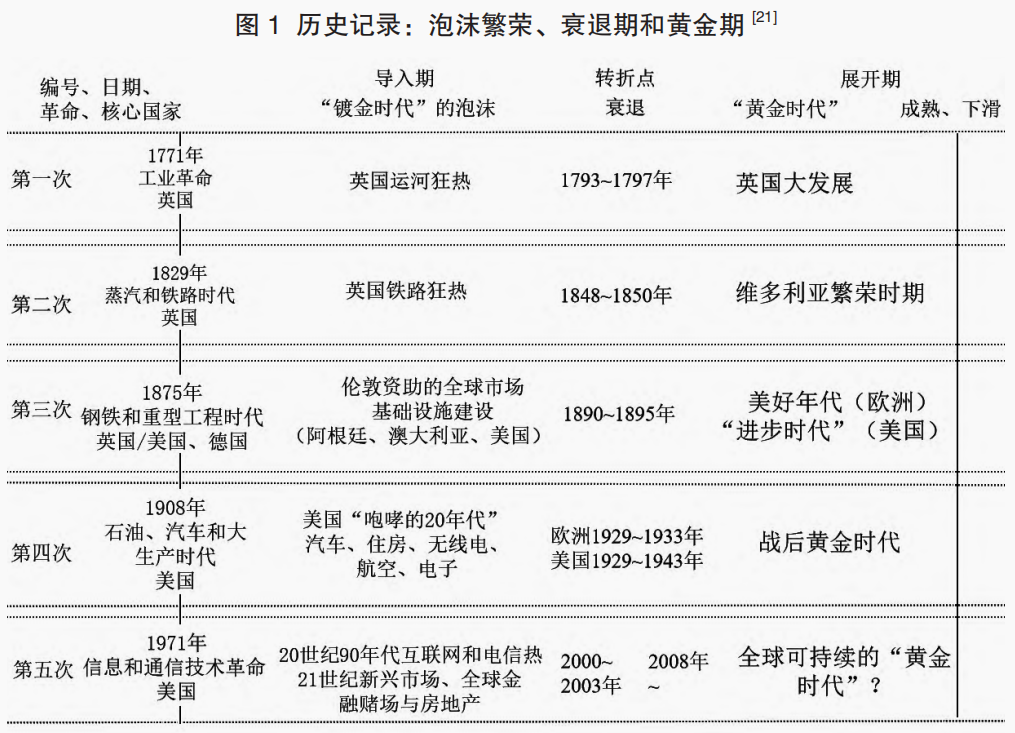 从技术进步的角度来看,一个经济长波逐步展开的核心是存在某种低成本、无限量供应的关键生产要素(通常来自材料与能源工业),其发展不仅会催生新的产业部门和基础设施等长波“引擎”部门,还会与整个经济系统的诸多产品和工艺结合,使“老工业”长出“新形态”。前述一系列转变使关键生产要素的价值最大化,而实现转变的要害在于,建立与之相适应的一整套新的生产组织原则。这一过程以核心国家为起点,并在相关技术逐渐成熟的过程中向发展中的边缘国家扩散,整体上可分为三个阶段——(1)导入期:关键生产要素技术大爆炸,引擎部门大发展。这些产业因此成为投资“风口”,大量金融资本涌入,直至其估值严重偏离实际价值,金融资本与生产资本有关回报方式与周期的分歧日益尖锐。这一过程最终在金融资本的裹挟下走向日益严重的贫富差距。(2)转折点:通过对制度框架的结构性调整克服市场失灵,重塑产业资本与金融资本的关系。受到引擎部门惯性吸引力的作用,导入期形成的金融泡沫即便破灭也不会自动流入其他产业,而改变这一局面只能借助有针对性的制度建设。(3)展开期:通过在更大范围内促进金融资本与生产资本的再次耦合,关键生产要素将重塑各个产业部门和整个社会经济体系,并突出表现为广泛的效率提升。随着回报难度不断增加,金融资本会从实体经济中抽离出来,寻求发展中国家和重大新技术的投资机会。