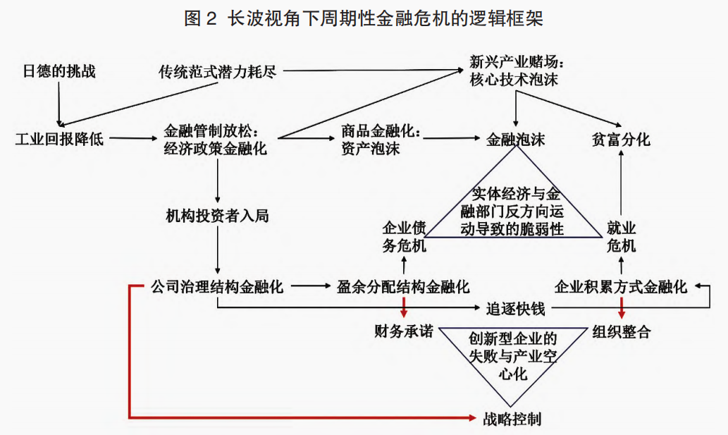 至此,我们基于长波的视角,可以梳理出形成过去四十多年金融化浪潮以及由此导致的近二十年三次全球金融危机的逻辑框架(见图2):整个过程始于20世纪70年代初大规模流水线生产方式的潜力枯竭,这迫使决策者放松了金融管制以提振投资回报,金融资本得以去寻找新兴产业。此后,ICT成为新的关键生产要素,并在四十多年间吸聚大量金融资本。金融去管制还把大型公共基金等影子银行变成了机构投资者,导致微观上公司治理、盈余分配结构与积累方式的金融化。这引发了分红、回购等金融性支出的大幅增长,破坏了企业创新的财务承诺,埋下了债务危机的种子,同时为金融市场提供了流动性支撑;而由此引发的裁员破坏了企业创新的组织整合,导致就业危机与分配差距拉大,也使全球产能过剩与局部需求不足并存成为可能。受此影响,作为产业革命的核心国家,美国的实体经济出现显著的能力退化与空心化,金融部门则在流动性支撑下形成资产泡沫。二者之间的这种反方向运动,构成了金融危机周期性积累与发生的底层逻辑。总之,美国在长波转折点上被路径锁定了。