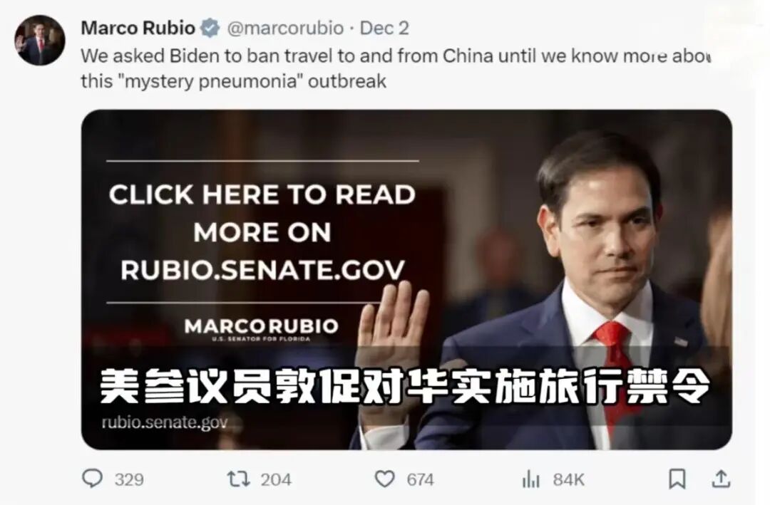 一是以美国反华政客卢比奥为首的5名共和党参议员,联名给拜登写信,认为近期中国呼吸道传染病病例激增,禁止美国游客到中国旅行。